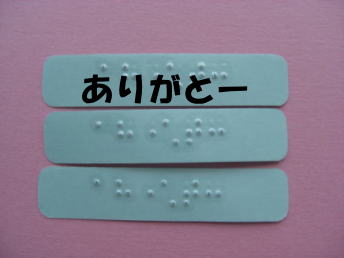 こちらの点字シールは 「ありがとう」 とシンプルに点字が打ってあります。視覚障がい者のSさんが、一つ、一つ、手打ちで作業を行っているものです。