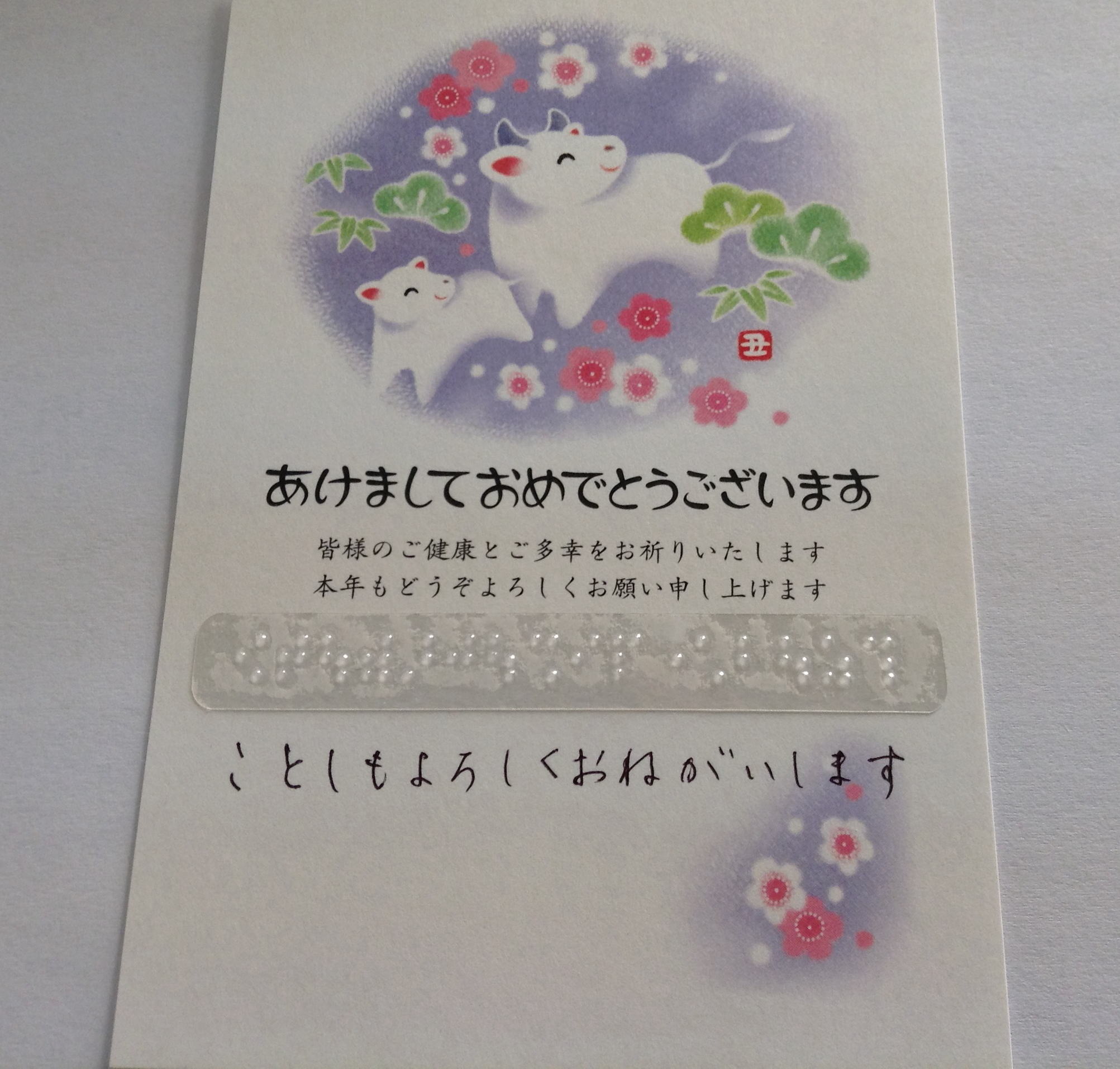 年賀状に点字入りタッグテープ(点字シール)を貼ってみました(シールは透明です)
