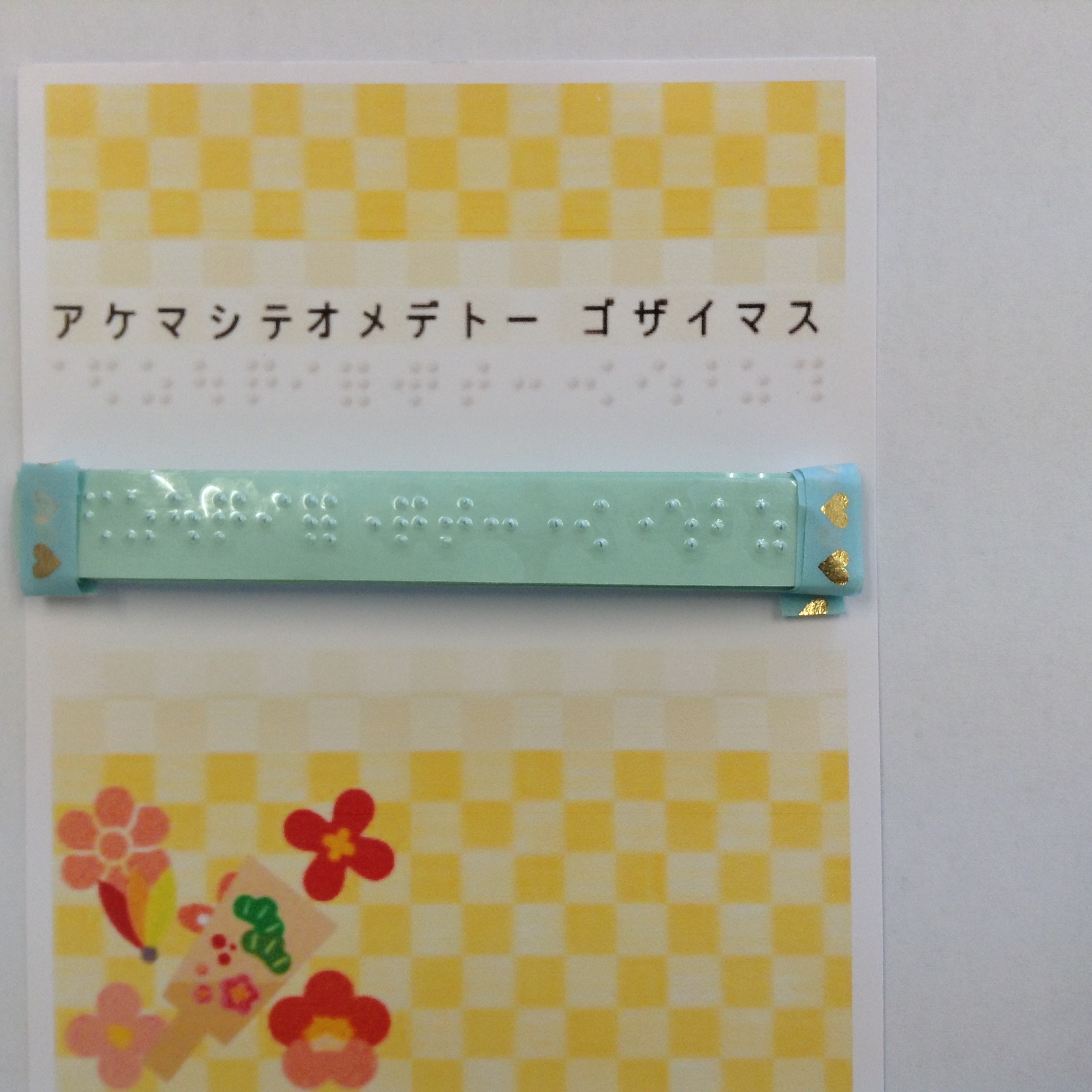 「シンネン、アケマシテ、オメデトー ゴザイマス」 と視覚障がい者がココロを込めて、手打ちで点字を刻したものです。(透明のシールです)